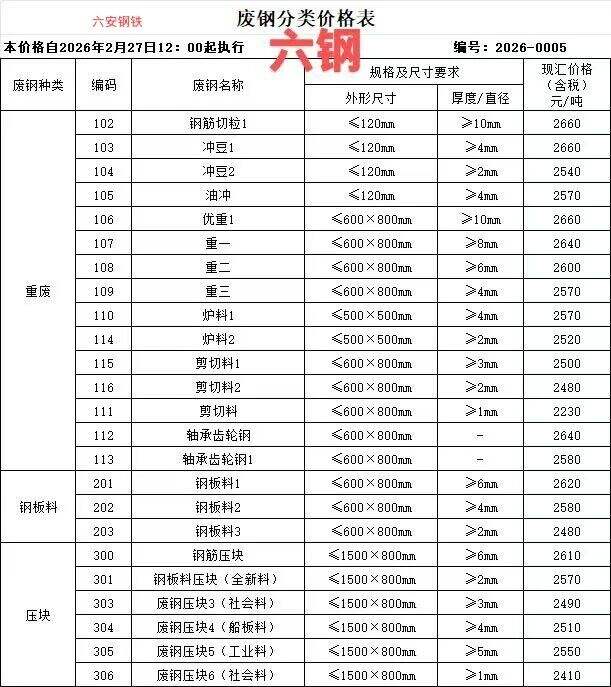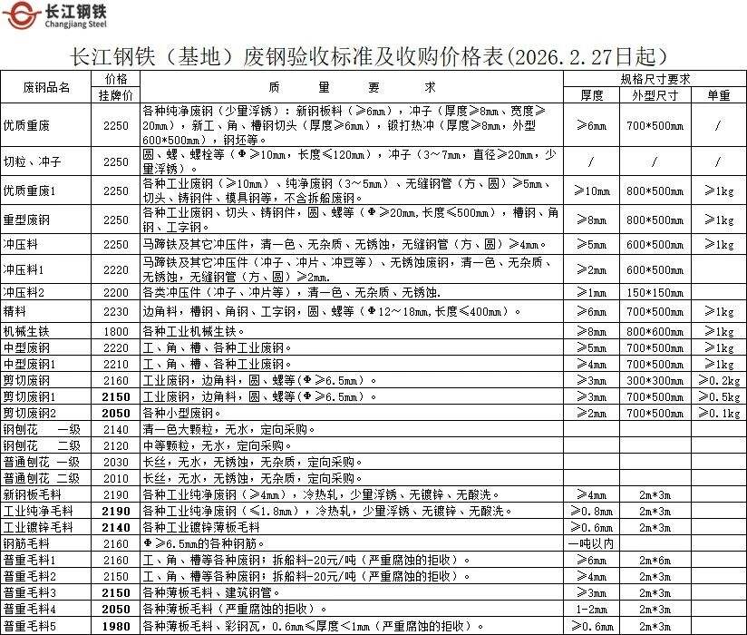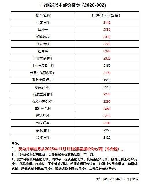 *月**日*時(shí)起,此次馬鋼誠(chéng)興重廢毛料、圓沖子、優(yōu)質(zhì)重廢毛料、優(yōu)質(zhì)重廢C毛料、刨花毛料上調(diào)**元/噸,低硫廢鋼、紅沖料、工業(yè)重廢毛料、普通打包用廢鋼Ⅱ、剪切料毛料、精選毛料上調(diào)**元/噸,鋼筋切粒上調(diào)**元/噸,其他品種價(jià)格不變。廢毛料最高****元/噸,圓沖子最高****元/噸,鋼筋切粒最高****元/噸,低硫廢鋼最高****元/噸,紅沖料最高****元/噸,工業(yè)重廢毛料最高****元/噸,工業(yè)重廢Ⅱ毛料最高****元/噸,普通打包用廢鋼Ⅱ最高****元/噸,破碎廢鋼*毛料最高****元/噸,破碎廢鋼Ⅱ最高****元/噸,優(yōu)質(zhì)重廢毛料最高****元/噸,優(yōu)質(zhì)重廢C毛料最高****元/噸,剪切料毛料最高****元/噸,精選毛料最高****元/噸,刨花毛料最高****元/噸,船板毛料最高****元/噸,冷板毛料最高****元/噸。以上價(jià)格不含稅。